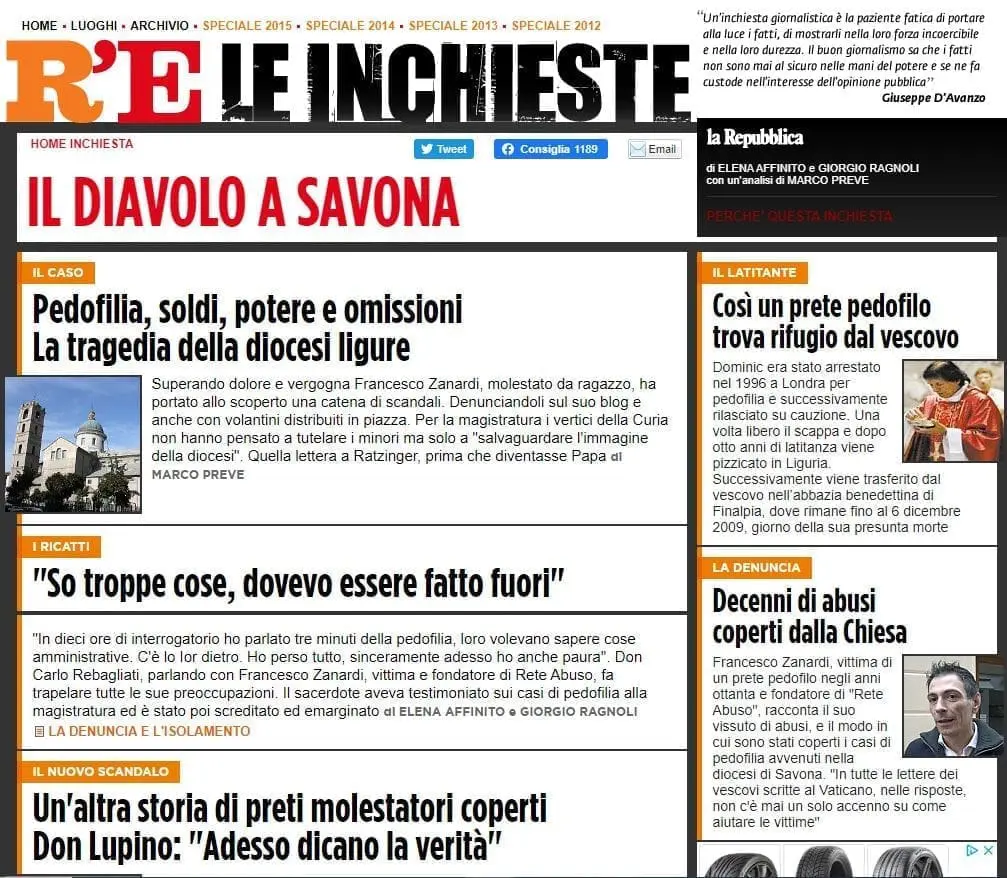 Se questa storia dove gli abusi si mescolano agli affari, ai soldi e al potere, si può oggi raccontare, il merito va riconosciuto in primis a Francesco Zanardi, 43 anni, molestato quando era ragazzo dal suo parroco, don Nello Giraudo. Francesco riesce a superare la vergogna, il dolore, il rischio di essere additato come un folle, e a molti anni di distanza dalle violenze subite, le denuncia. È un fiume in piena che conosce molti segreti della curia savonese. E li racconta: sui blog, sui volantini distribuiti in piazza, ma anche a palazzo di giustizia. Il procuratore Francantonio Granero e il pm Giovanni Battista Ferro per tre anni affronteranno una prova umana, ancor prima che professionale, pesante, insana.
