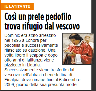 Mentre esplode la vicenda dei preti pedofili e dei misteri della diocesi di Savona, nel capoluogo ligure si sparge la notizia che un’altra vittima ha denunciato un prete pedofilo consegnando una lettera a don Giovanni Lupino, parroco di San Dalmazio in Lavagnola. Nella