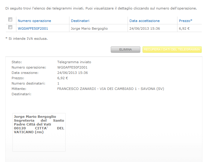 Tornando a noi e ai più di 7500 firmatari della petizioneavviata su Change.org, il 24 giugno Rete L’ABUSO, autrice dell’inchiesta che coinvolgerebbe alti prelati della Santa Sede ha colto l’appello di Papa Francesco “andate controcorrente” e ha inviato una letteraraccomandata al Papa, per non correre il rischio che la Segreteria di Stato Vaticana “smarrisse” la lettera, ha inviato anche un telegramma, diretto proprio al Papa e contenente il numero di tracciabilità della lettera. Il telegramma (come potete vedere nella foto) risulta regolarmente consegnato e ricevuto dal Papa o al massimo da un suo delegato, mentre la raccomandata al momento risulta in giacenza presso le poste, non quelle italiane, le quali la hanno consegnata il 27 di giugno a quelle vaticane, ma giace da 5 giorni a poche decine di metri dal Portone di Bronzo, senza che nessuno la ritiri. Naturalmente non vogliamo pensare e neppure insinuare che Papa Francesco sia in malafede, certo che il mancato ritiro del testo a lui inviato sta sollevando parecchie polemiche e anche una certa delusione, soprattutto da parte dei credenti che hanno preso molto sul serio gli appelli del pontefice e confidano che questi si concretizzino e non restino solamente belle parole. Da qualche giorno, molte persone ci scrivono sia per mail che sulla piattaforma di Change.org per avere notizie sul ritiro della lettera, ma per ora ancora nulla. Pubblichiamo quindi il numero dalla raccomandata (145990903759 ) in modo tale che chiunque possa controllare dal sito delle Poste Italiane l’avvenuto ritiro, evitando così l’ingente numero di richieste che arrivano a Rete L’abuso.