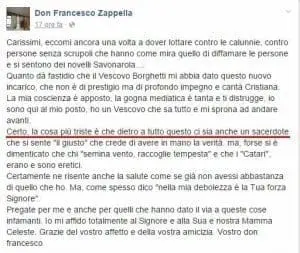Invitiamo caldamente don Francesco Zappella a formalizzare quanto prima le sue dichiarazioni non solo alla stampa, ma anche all’Autorità Giudiziaria, l’unica che potrà appurare il reale stato delle cose ed eventualmente procedere.