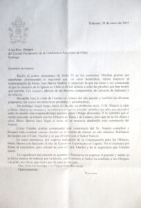However, a serious problem came up at the end of the year. The Nuncio asked Mons. Barros to resign and encouraged him to take a sabbatical, (for perhaps a year), before assuming any other responsibilities as a Bishop. And he told him the same course of action would be taken with Bishops of Talca and Linares, but that nothing should be said to them. Mons. Barros wrote a resignation letter in which he mentioned the Nuncio’s comment.