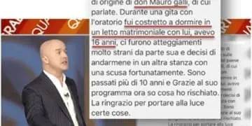 Grazie alla testimonianza coraggiosa della presunta vittima di don Mauro Galli di Rozzano, a processo in questi giorni per l’ipotesi di reato di abuso sessuale aggravato, sono emersi nuovi importanti particolari inquietanti su cui ora, presumibilmente, la Magistratura vorrà fare luce. La presunta vittima di don Galli, oggetto del procedimento penale in corso, racconta per la prima … Leggi tutto Caso don Mauro Galli: emergono nuovi particolari inquietanti, UN ALTRO MINORE fu costretto a dormire nel letto matrimoniale del prete.