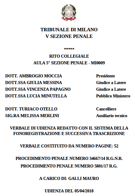 Sono infatti ora disponibili le trascrizioni dell’udienza penale che si è svolta pochi giorni fa, il 5 Aprile 2018, nella quinta sezione penale del Tribunale di Milano.