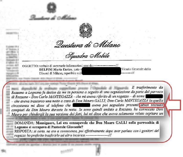 - Oppure mons. Delpini tenta di far credere che la parola “abuso” e “presunto abuso sessuale”, come lui stesso esplicita, si riferisse ad una parola utilizzata impropriamente da tanti, da tutti, da lui stesso nell’accezione “abuso sessuale” soltanto per descrivere il fatto che il don Galli avesse portato il minore nel letto tenendolo abbracciato. Nella sua stessa deposizione (come riscontrato anche da altre testimonianze e dalla deposizione stessa di don Mauro) Delpini dice di aver convocato subito il prete che ammetteva di aver portato a letto il minore “…ha per altro ammesso di aver dormito con il ragazzo quella notte…”.
