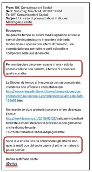 Un vero e proprio maldestro pasticcio, ulteriormente aggravato dall’estremo tentativo di distogliere l’attenzione dai fatti certi, quelli certificati dal Tribunale, dalle indagini e dalla polizia: solo un paio di settimane fa, il portavoce ufficiale di mons. Delpini, inviava segretamente una mail a tutti i prelati della Diocesi. In quella mail invitava i sacerdoti a muoversi segretamente, per divulgare il contenuto del Comunicato ufficiale della Diocesi di Milano, per contrastare quanto raccontato dai media presenti nelle aule di giustizia. La comunicazione segreta si concludeva con la raccomandazione firmata da don Davide Milani di non far sapere della comunicazione stessa ma solo indirizzare a leggere il comunicato della diocesi.