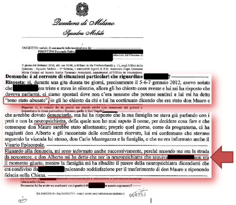“…Mi è stato detto sia dei genitori che anche da Don Alberto che la psicologa riportava in questo momento troppo fragile per il minore per poter affrontare una denuncia e di aspettare un attimo che ci si stava muovendo, che erano già stati informati tutti i livelli della chiesa quindi il parroco, il vicario…”