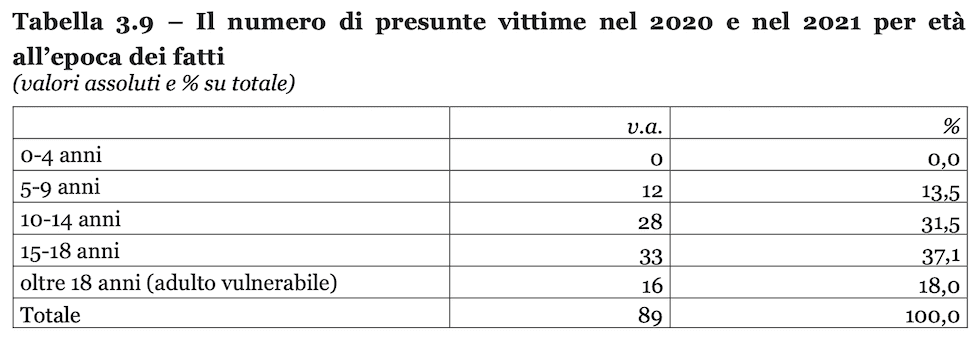 «L’età delle presunte vittime segnalate nel biennio 2020-2021», dice il rapporto, si concentra nella fascia d’età 10-18 anni, col 37,1%. il 31,5% delle presunte vittime ha un’età compresa tra i 10 e i 14 anni. Il 18,0% di casi segnalati riguarda «presunte vittime over 18 anni, spesso in questi casi si è trattato di adulti considerati vulnerabili». Nessuna segnalazione per presunte vittime che abbiano meno di 5 anni, mentre nella fascia d’età 5-10 anni le segnalazioni rappresentano il 13,5% del totale.