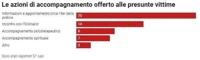 Infine, in un’altra tabella, il documento spiega gli interventi che sono stati offerti dopo le segnalazioni. Qui i casi considerati sono solamente 57: in 4 casi su 10 sono state fornite «informazioni e aggiornamento sull’iter della pratica». Ai presunti autori degli abusi sono stati proposti «percorsi di riparazione, responsabilizzazione e conversione, compresi l’inserimento in “comunità di accoglienza specializzata” (un terzo dei casi rilevati) e percorsi di “accompagnamento psicoterapeutico” (circa un quarto dei casi)». Per quanto riguarda gli interventi concreti si dice: «A seguito della trasmissione della segnalazione all’Autorità ecclesiastica da parte dei Centri di ascolto, tra le azioni poste in essere sono risultati prevalenti i “provvedimenti disciplinari”, seguiti da “indagine previa” e “trasmissione al Dicastero per la Dottrina della Fede”». Non si parla in alcun caso di segnalazione alle autorità.