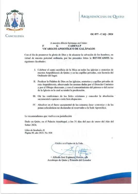 La sanzione è stata inflitta da Monsignor Bonilla in quanto vicario delle Galapagos, ma poiché il delitto è stato commesso a Quito, tale sanzione avrebbe dovuto essere comminata anche dalla massima autorità ecclesiastica di questa città. Sebbene la sentenza canonica abbia effetto immediato, solo cinque anni dopo, l’arcivescovo di Quito e primate dell’Ecuador, Alfredo José Espinoza Mateus, attraverso la lettera ufficiale 077-CAQ-2024, datata 31 gennaio 2024 , fa informare P. Cadena della revocargli le facoltà ministeriali, raccomandandogli però di ritornare nella sua giurisdizione, nonostante il sacerdote fosse già tornato alle Galapagos.