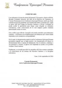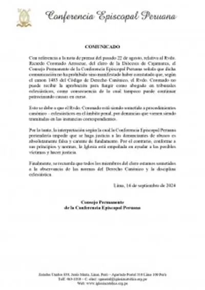 Non solo, contro Coronado parte un vero e proprio attacco concentrico: il 24 agosto la Conferenza Episcopale peruviana annunciava che monsignor Coronado non poteva più esercitare come canonista in Perù e quindi non poteva continuare a difendere i suoi clienti attuali. Una decisione che curiosamente anticipava la lettera del 29 agosto con cui il vescovo di Cajamarca (diocesi di appartenenza del canonista) gli comunica che presso il Dicastero del Clero in Vaticano è stato depositato un fascicolo a suo carico per un presunto delitto non meglio precisato “contra sextum” (ma fonti della Bussola parlano di un rapporto stabile con adulto consenziente); e che lo stesso Dicastero gli offre la possibilità di fare richiesta volontaria al Papa di chiedere la dispensa dal sacerdozio pena «l’avvio di un processo penale amministrativo». Poi un comunicato del Consiglio Permanente della Conferenza Episcopale pubblicato il 14 settembre (foto a dx) giustifica proprio con l’avvio del processo penale la decisione di proibire a Coronado l’attività nei tribunali ecclesiastici annunciata il 24 agosto. Se pensiamo alla lentezza e alla reticenza in Vaticano riguardo a recenti scandali in fatto di abusi sessuali, la rapidità e la severità delle misure contro monsignor Coronado (che peraltro respinge tutte le accuse) sono sorprendenti e molto più che sospette, visto anche che non si tratta di abusi ma eventualmente di rapporti tra adulti consenzienti.