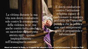 Questo significa che la vittima durante la sua vita non dovrà combattere solo contro le conseguenze della violenza in sé, ma anche contro tutto ciò che un sacerdote rappresenta ancora oggi – spesso inspiegabilmente – nell’immaginario comune. E dovrà combattere contro l’istituzione religiosa, di cui il pedofilo fa parte, capace di condizionare in maniera profonda sia l’opinione pubblica che la politica con suoi onnipresenti organi di propaganda e informazione, al fine di preservare in primis l’immagine pubblica del papa. E poco importa a costoro se questo atteggiamento abbia come diretta conseguenza la lesione di un diritto umano fondamentale: la salute psicofisica della persona.