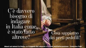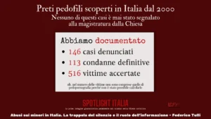La mia indagine giornalistica conferma quanto scoperto e accertato dall’associazione Rete L’abuso, una onlus che è anche l’unica realtà della società civile nel nostro Paese che si occupa di tutela dei diritti delle vittime di preti violentatori.