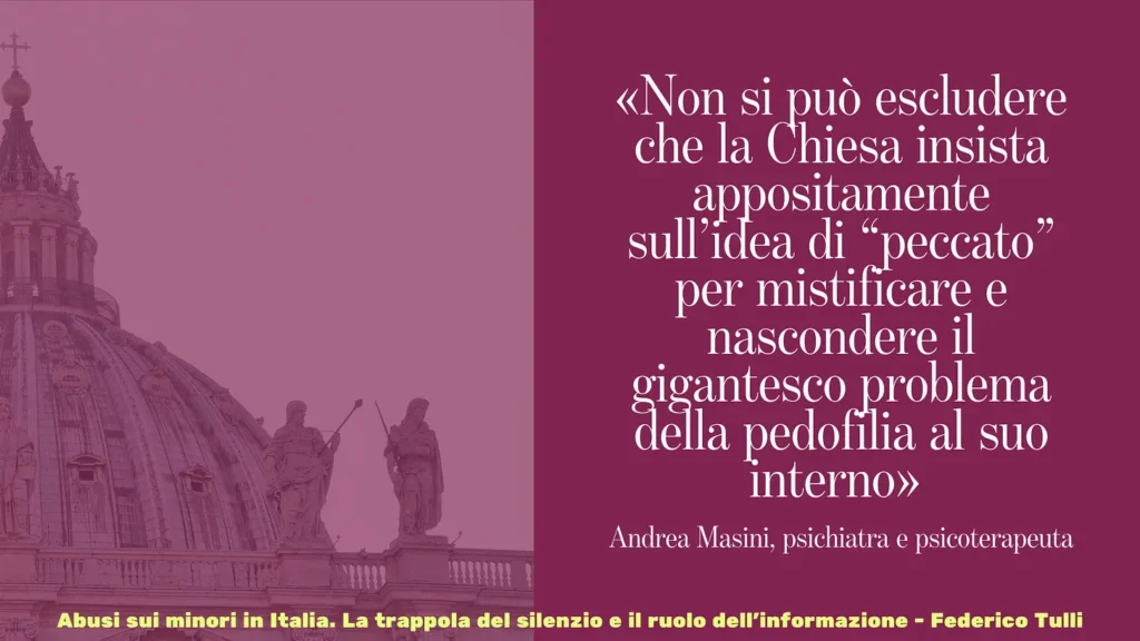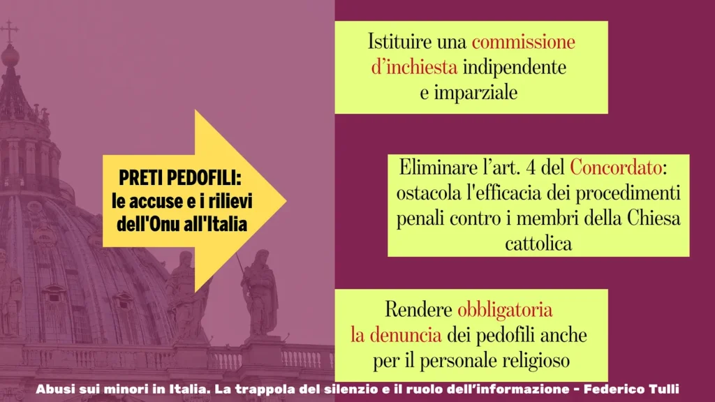 È bene ribadire a questo punto che la cosiddetta “giustizia” ecclesiastica si fonda sulla convinzione che il più violento dei crimini nei confronti di un bambino o una bambina sia prima di tutto un peccato, un delitto contro la morale. E come tale viene trattato: il punto non è tanto evitare che un pedofilo ghermisca la sua preda ma che un prete e la sua vittima facciano del «male» a Dio. È l’offesa alla divinità che è intollerabile, sta qui la «tolleranza zero» di papa Francesco, tanto esaltata anche dalla stampa laica. Si tratta di una visione umanamente e scientificamente inaccettabile (come si evince anche dalle slide appena mostrate), di cui l’Italia – uno Stato laico per Costituzione – non tiene conto nel tenere in vita il Concordato e l’articolo 4 in particolare. Ma anche nel disapplicare la Convenzione di Lanzarote.