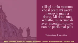 La mia indagine giornalistica conferma quanto scoperto e accertato dall’associazione Rete L’abuso, una onlus che è anche l’unica realtà della società civile nel nostro Paese che si occupa di tutela dei diritti delle vittime di preti violentatori.
