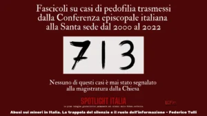 E ancora, il 17 dicembre del 2022 mons. Baturi, segretario generale della Conferenza episcopale, ha rivelato che dal 2010 al 2020 sono stati «613 i fascicoli trasmessi dalle diocesi italiane al dicastero per la Dottrina della fede», cioè alla Santa sede. Altri 100 fascicoli erano stati trasmessi tra il 2000 e il 2010. Sommando questi numeri viene fuori che tra il 2000 e il 2023 in Italia sono stati denunciati almeno 146+613+100 (cioè 859) casi di pedofilia nella Chiesa. Nemmeno i 713 fascicoli della Cei sono mai stati condivisi con la magistratura, sempre in virtù del “diritto” a non collaborare sancito dall’articolo 4 del Concordato.