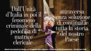 “Chiesa e pedofilia, il caso italiano”. Dopo oltre 200 pagine di inchiesta, fonti verificate, documenti e testimonianze alla mano, sono giunto alla conclusione opposta rispetto a quella del monsignore, avendo scoperto che dall’Unità d’Italia in poi la pedofilia di matrice clericale attraversa senza soluzione di continuità tutta la storia del nostro Paese.