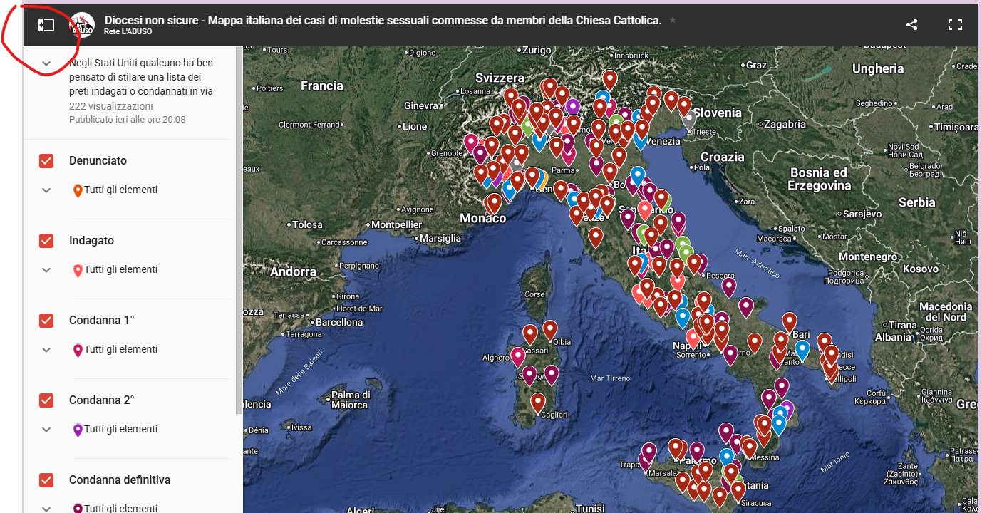 Oggi invece la trovate suddivisa nei diversi gradi, dalla segnalazione alla condanna definitiva. Gradi che trovate (correlati al nominativo del religioso in oggetto) nel menu a sinistra della mappa dal quale potrete filtrare (semplicemente spuntando la casella) i risultati della scheda personale in base al grado di giudizio del religioso.