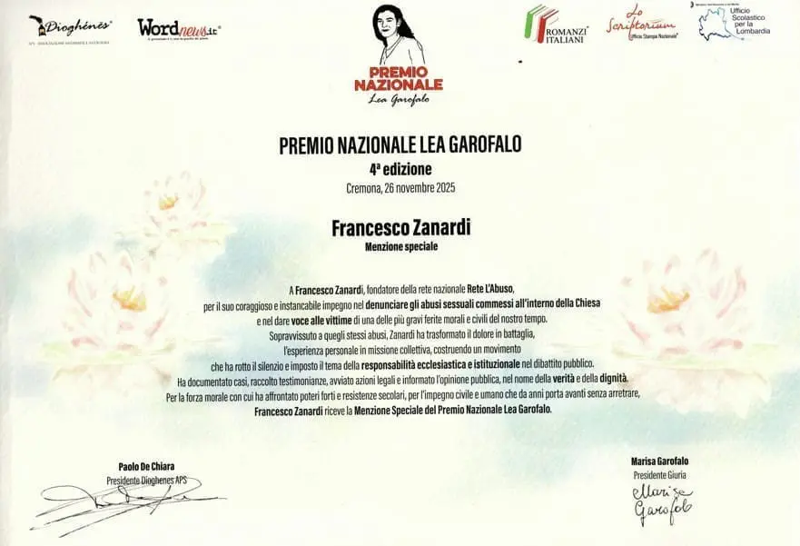 “A Francesco Zanardi, fondatore della rete nazionale Rete L’ABUSO, per il suo coraggioso e instancabile impegno nel denunciare gli abusi sessuali commessi all’interno della Chiesa e nel dare voce alle vittime di una delle più gravi ferite morali e civili del nostro tempo.