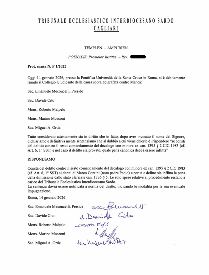 Sembra essere arrivato ad una svolta nella vicenda di don Paolo Contini, anche il Tribunale ecclesiastico sardo che, il 14 gennaio 2026 arriva a pronunciarsi su Valerio Manca il sacerdote accusato da don Paolo e altri quattro ragazzi, di molestie sessuali, che nel caso di don Paolo avvennero quando era ancora un seminarista.