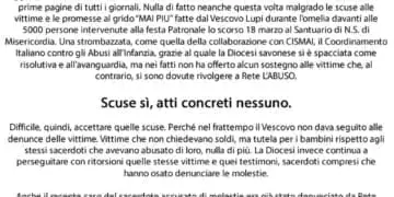 Comunichiamo che nella giornata di sabato 20 aprile dalle ore 10 alle 14 e dalle 16 alle 19 in corso Italia angolo via Paleocapa e piazza Sisto IV gli attivisti di Rete L’ABUSO effettueranno un volantinaggio per chiedere conto alla Diocesi di Savona-Noli e al Vescovo Lupi, delle promesse tutt’ora in’evase, fatte a vittime e fedeli lo scorso 18 marzo...