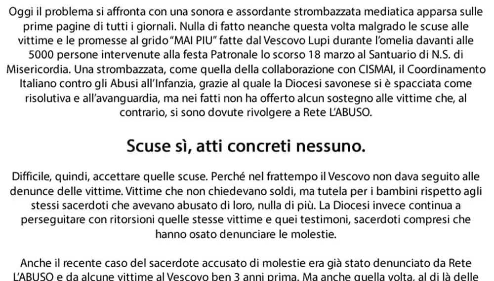 Egregio monsignore, le scrivo dopo essermi confrontato con le altre vittime savonesi, alla luce del provvedimento emesso dal tribunale, ma...