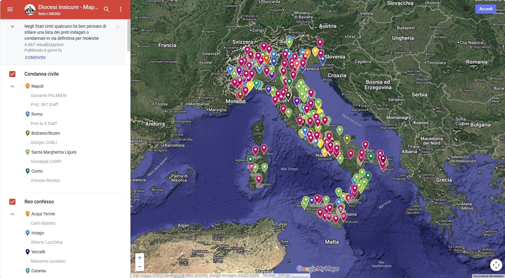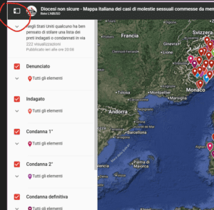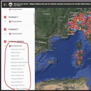 Oggi invece la trovate suddivisa nei diversi gradi, dalla segnalazione alla condanna definitiva. Gradi che trovate (correlati al nominativo del religioso in oggetto) nel menu a sinistra della mappa dal quale potrete filtrare (semplicemente spuntando la casella) i risultati della scheda personale in base al grado di giudizio del religioso.